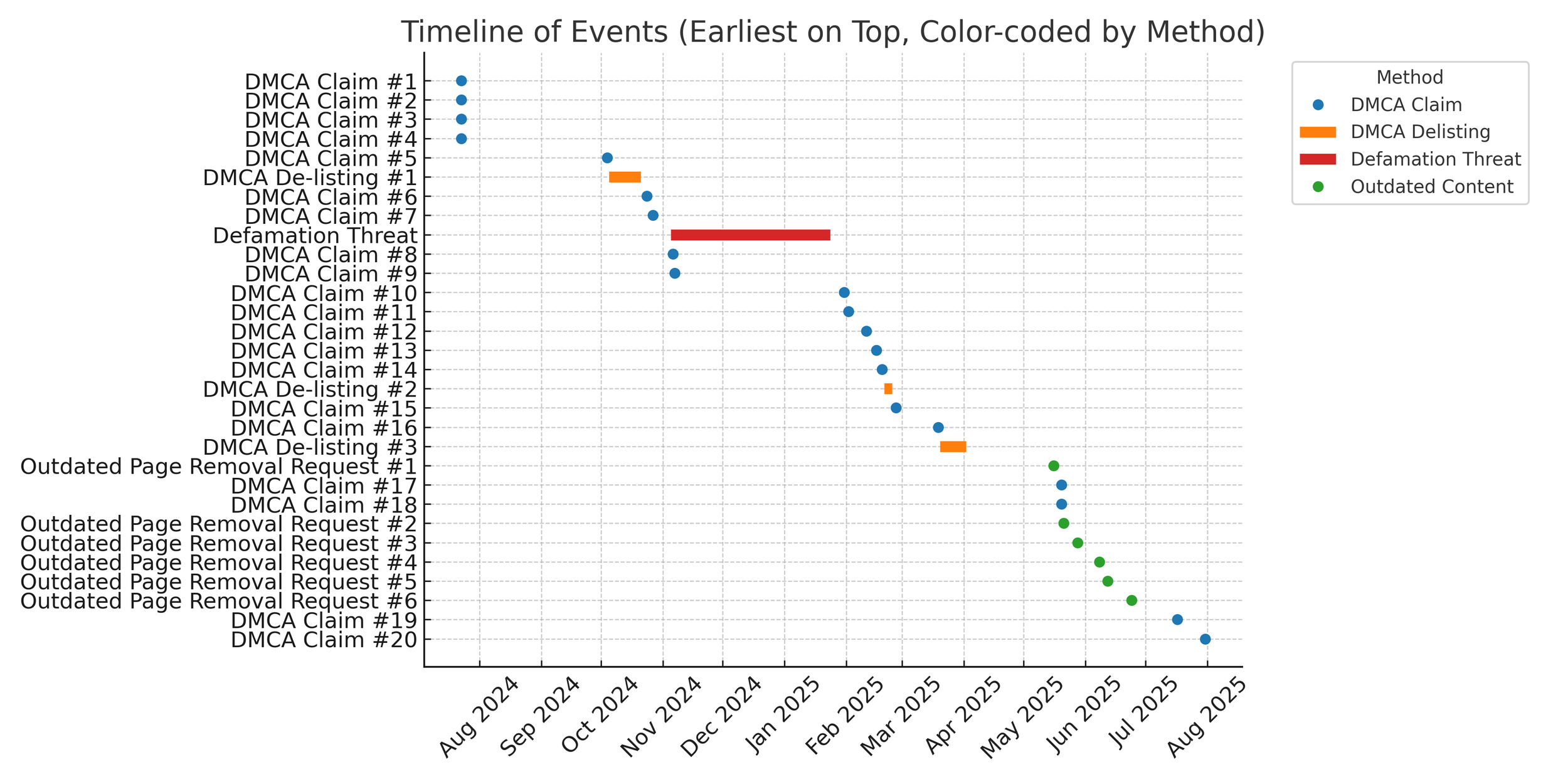 The last note from my lawyers was sent in late January. Then, predictably, the bogus DMCA claims resumed on January 31st, 2025 after a 3-month hiatus that directly coincided with the defamation threat. One DMCA claim filed on February 19th resulted in the 2nd de-listing from Google Search; another one filed in March caused the 3rd de-listing. And they haven’t slowed down — as of the last update of this article, the most recent DMCA claims were filed on July 31st, 2025.